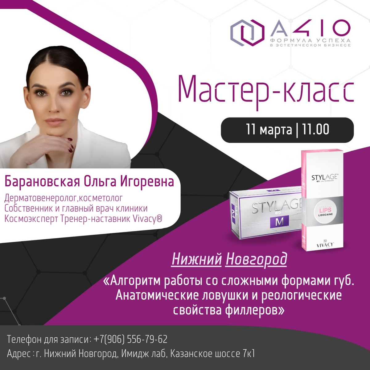 💋 Тема✍️: «Алгоритм работы со сложными формами 🫦 губ: анатомические ловушки и реологические свойства филлеров». 📅 11 марта ⏱️Время: 11:00 🏢Место проведения: г. Нижний Новгород, Казанское шоссе 7к1, «ИмиджЛаб» 👩⚕️Спикер: Барановская Ольга Игоревна — врач-косметолог, эксперт Vivacy. Программа: 📋 11.00-13.00 Теоретическая часть🧠📚 13.00-13.30 Кофе-брейк☕️ 13.30-16.00 Практическая часть💉 💫 Зарегистрироваться можно по номеру 📱: +7(906) 556-79-62 или на сайте 💻: A410.ru 💫 Для получения полного прайс-листа переходите по ссылке 👉 http://clck.ru/38NMpp #Обучение_и_вебинары