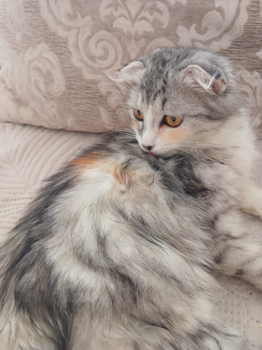 Малышку нашли на улице, временно приютили. Девочка вислоухая, пушистенькая, очень необычного серебристо-трехцветного цвета.