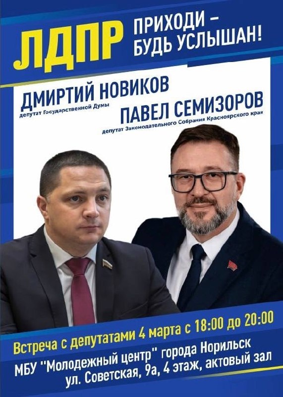 Завтра депутаты Госдумы и Законодательного собрания края Дмитрий Новиков и Павел Семизоров работают в Норильске. В 18.00 состоится встреча в молодежном центре. Приходите, поговорим и обсудим важное для Севера. Обратиться в ЛДПР с предложениями, идеями или за помощью может любой желающий. В приоритете у ЛДПР решение задач каждого конкретного человека, помощь каждой семье.