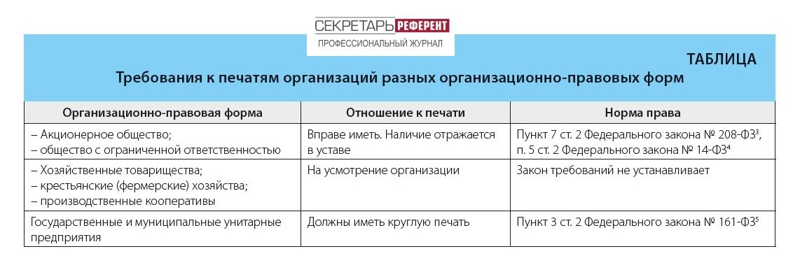 Законодатель дифференцирует требования к печатям организации в зависимости от типов организационно-правовых форм организаций (Таблица).