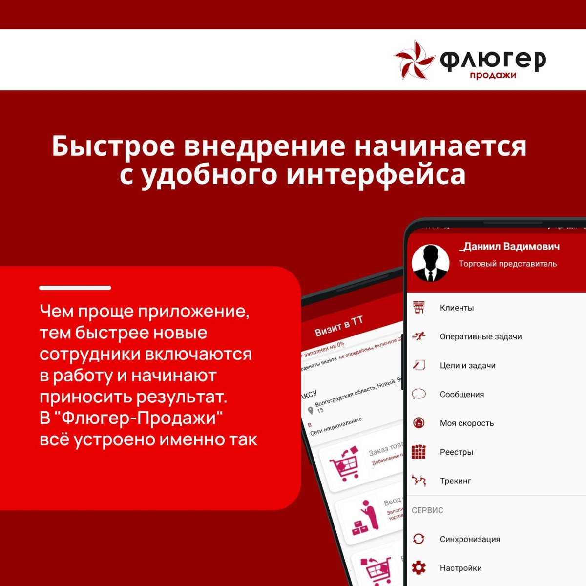 Чтобы торговые представители быстро включались в работу и показывали высокие результаты, приложение должно быть по-настоящему удобным. В «Флюгер-Продажи» мы сделали интерфейс таким, что сотрудник концентрируется на продажах, а не на поиске нужных кнопок. Это ускоряет внедрение и повышает эффективность каждого визита. Как это выглядит на практике После входа сотрудник сразу видит то, что нужно для начала работы: маршрутный лист на сегодня или список клиентов. В торговой точке перед ним появляются только те этапы визита, которые действительно требуется пройти. Система скрывает всё лишнее, чтобы представитель не отвлекался и ничего не пропускал. Заказ оформляется за три касания: добавить позицию, выбрать количество удобным слайдером, сохранить. А чтобы подобрать товары, которые клиент брал раньше, достаточно одного клика. Каталог товаров представлен в виде карточек с фотографиями. Не нужно вчитываться в описания — достаточно взглянуть на изображение, чтобы понять, о чём идёт речь. Ф