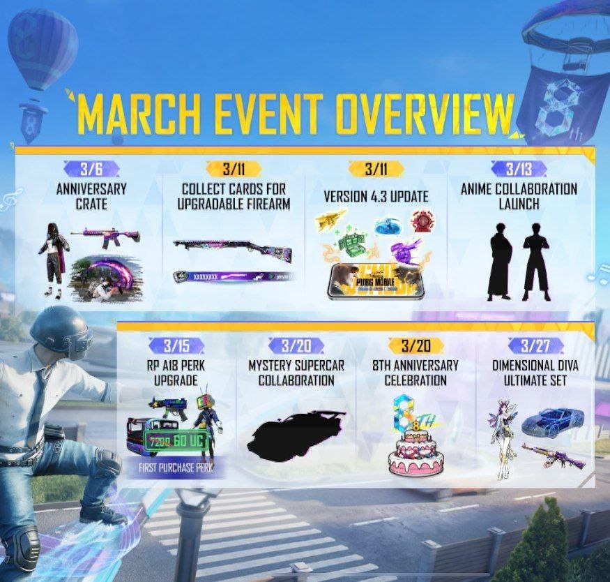 : 🔸 6 Марта — Юбилейный кейс 🔸 11 Марта — Улучшаемое оружие 🔸 11 Марта — Обновление версии 4.3 🔸 13 Марта — Аниме «Jujutsu Kaisen» 🔸 15 Марта — Предзаказ RP A18 🥇 🔸 20 Марта — Суперкар Apollo 🔸 20 Марта — 8-я годовщина 🔸 27 Марта — Ultimate-сет Наш бот для пополнения UC: @OneTwoPay_bot 😎 PUBG Mobile