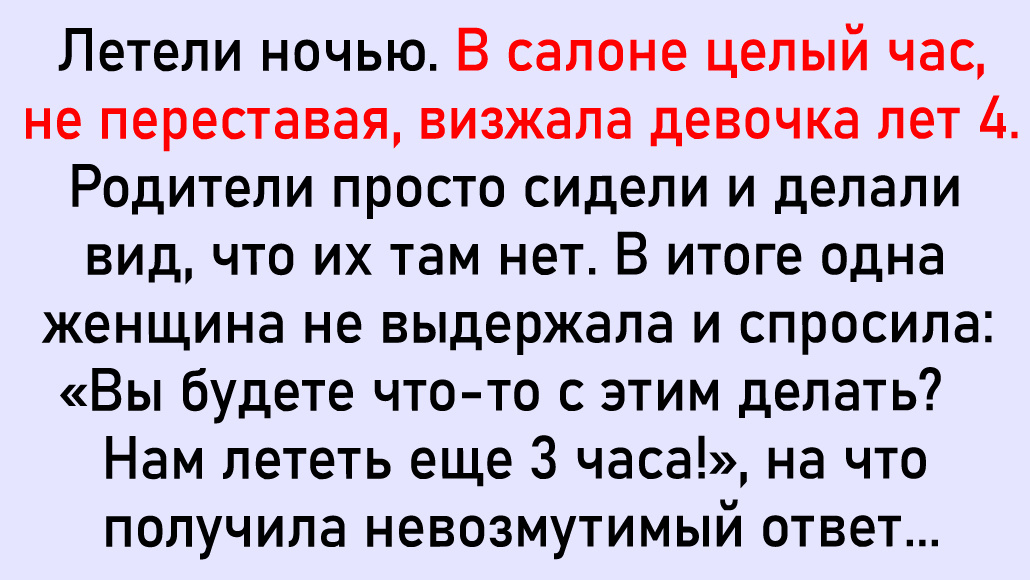 Летели ночью. В салоне целый час, не переставая, визжала девочка лет 4. Родители просто сидели и делали вид, что их там нет. В итоге одна женщина не выдержала и спросила: «Вы будете что-то с этим делать? Нам лететь еще 3 часа!», на что получила невозмутимый ответ: «Поорет и успокоится, мы будем ждать». Я после этой женщины уже тоже гаркнула на родителей, чтоб приняли меры. И знаете, помогло. © zlayamatreha / Pikabu