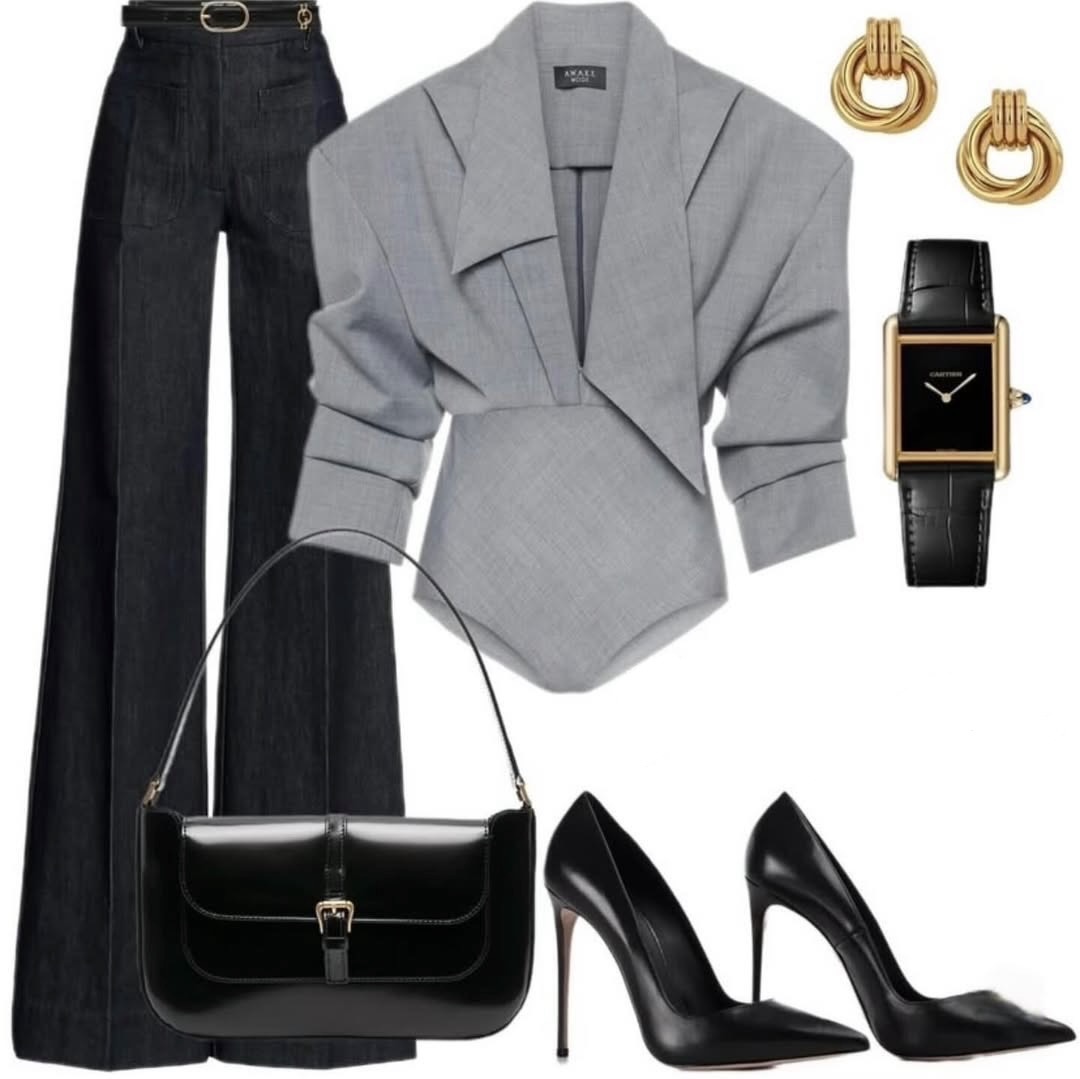 Этот весенний образ — про силу формы и точность деталей. Темный клеш вытягивает и стройнит, серый верх с архитектурными плечами делает силуэт выразительным, а черные аксессуары — сумка и лодочки — собирают композицию в строгую, уверенную линию. Золото в серьгах и часах добавляет теплый свет и превращает сдержанный комплект в настоящую «тихую роскошь».
