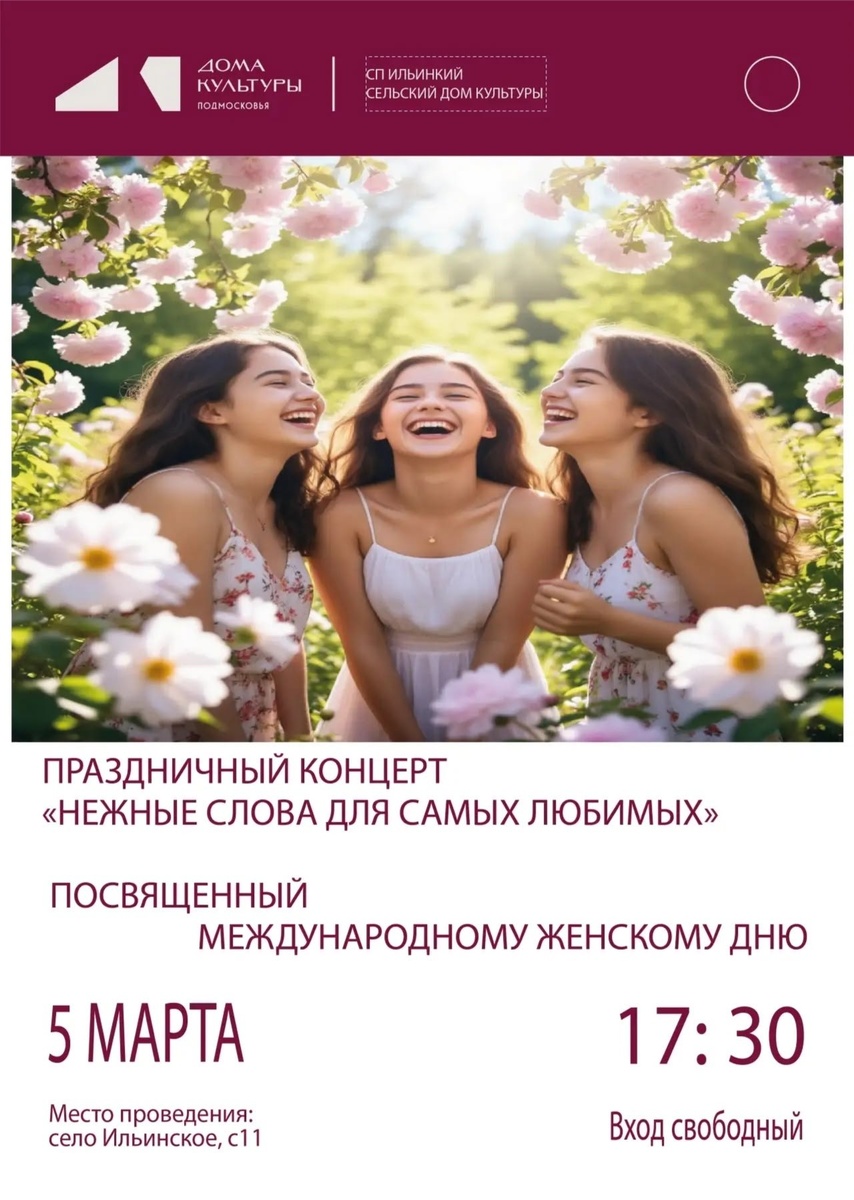 ✨ 🌷 Дорогие жители и гости нашего села.🌷 Приглашаем вас на праздничный концерт, посвященный Международному женскому дню.💐 🚫 Возраст: 0+ 📆 05.03.2026🕒17:30 🏢 Ильинский сельский дом культуры (СДК) 📍 г.о. Домодедово, с.Ильинское, ул.Бригадная, д.11 💰 Вход свободный❗️ ✅ Мероприятия Домодедово https://dzen.ru/id/66f10385cc4c5a16f7b5fb02 https://vk.ru/domodedovo_events http://dzen.ru/domodedovo_events