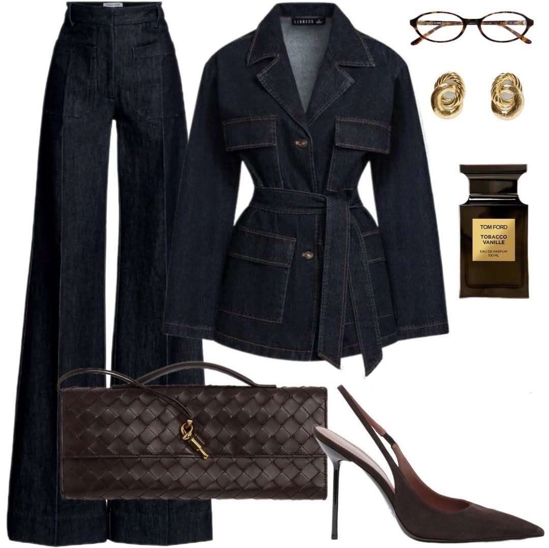 Этот комплект — про уверенность без громкости. Темный деним создает основу и идеальную вертикаль, пояс на жакете подчеркивает талию, а шоколадные аксессуары — сумка и обувь — добавляют тепла и благородства. Очки и золотые серьги завершают образ интеллигентными штрихами, а аромат ставит точку — как личная подпись.