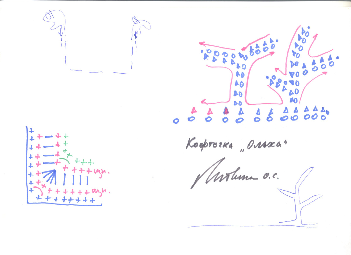 Для вязания кофточки "Ольха" вам потребуется 350 гр. пряжи 400м/ 100 гр. любого качества: шерсть , полушерсть, хлопчатобумажной пряжи цвета "А". Отделочной нити тоже любого качества 150 гр. цвет "Б".