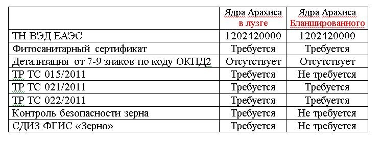 Различия лущёного арахиса в лузге и бланшированного, установленные к применению и исполнению регламенты, и обязательных требований прохождения государственного контроля на границе РФ. Руководствуясь основными правилами интерпретации ТН ВЭД и наименованием, на основе текста позиций и примечаний, плоды арахиса очищенного (лущёного) от околоплодной оболочки (скорлупы), не обжаренные и не приготовленные иным способом, классифицируются в товарную позицию ТН ВЭД ЕАЭС: 1202420000. Лущёный арахис (ОКПД 2: 01.11.83) — это плоды арахиса, очищенный от околоплодной оболочки (скорлупы), в которой они развиваются под землёй, на ядрах такого арахиса остаётся характерная для цельного ореха тонкая лузга (кожица) красно-бурой окраски, специальная кратковременная обработка паром на производстве позволяет такую тонкую лузгу удалить. Такая специальная обработка паром, придаёт ядрам лущёного арахиса визуальные отличия, которые позволяет различать их не только по наименованию продукции, но и по виду ядер: Яд