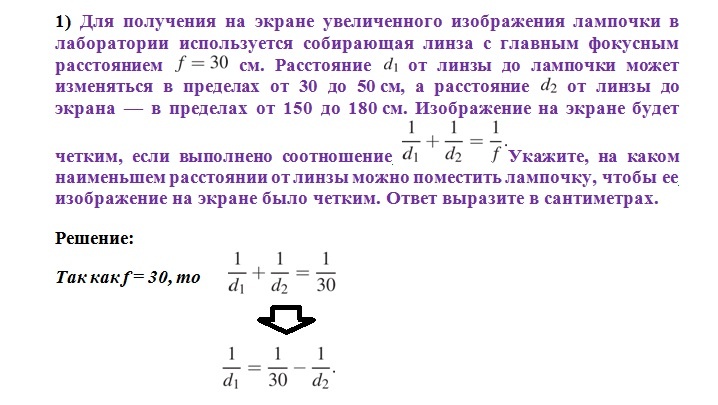 Полезно учащимся 10,11 классов Разберём решение трёх задач А дальше возможно два способа решения. Первый: Если Вы понимаете, что d1 принимает наименьшее значение тогда, когда дробь 1/d1 принимает наибольшее значение, то есть и разность 1/30 - 1/d2 тоже принимает наибольшее значение, а это возможно, если дробь 1/d2 принимает наименьшее значение, то есть d2 должно быть наибольшим, а именно d2 = 180, Тогда Число 36 удовлетворяет промежутку, указанному в условии (от 30 до 50) Ответ: 36 Если же описание в указанном способе Вам не понятно, тогда идём другим путём Второй способ Подставляем в формулу вместо d2 по очереди оба числа 150 (наименьшее) и 180 (наибольшее) и находим значение d1 Выбираем наименьшее Ответ: 36 Нам нужна минимальная скорость, поэтому Ответ: 7 Ответ: 18 Полезно вспомнить(это всё решение заданий №9): До встречи!