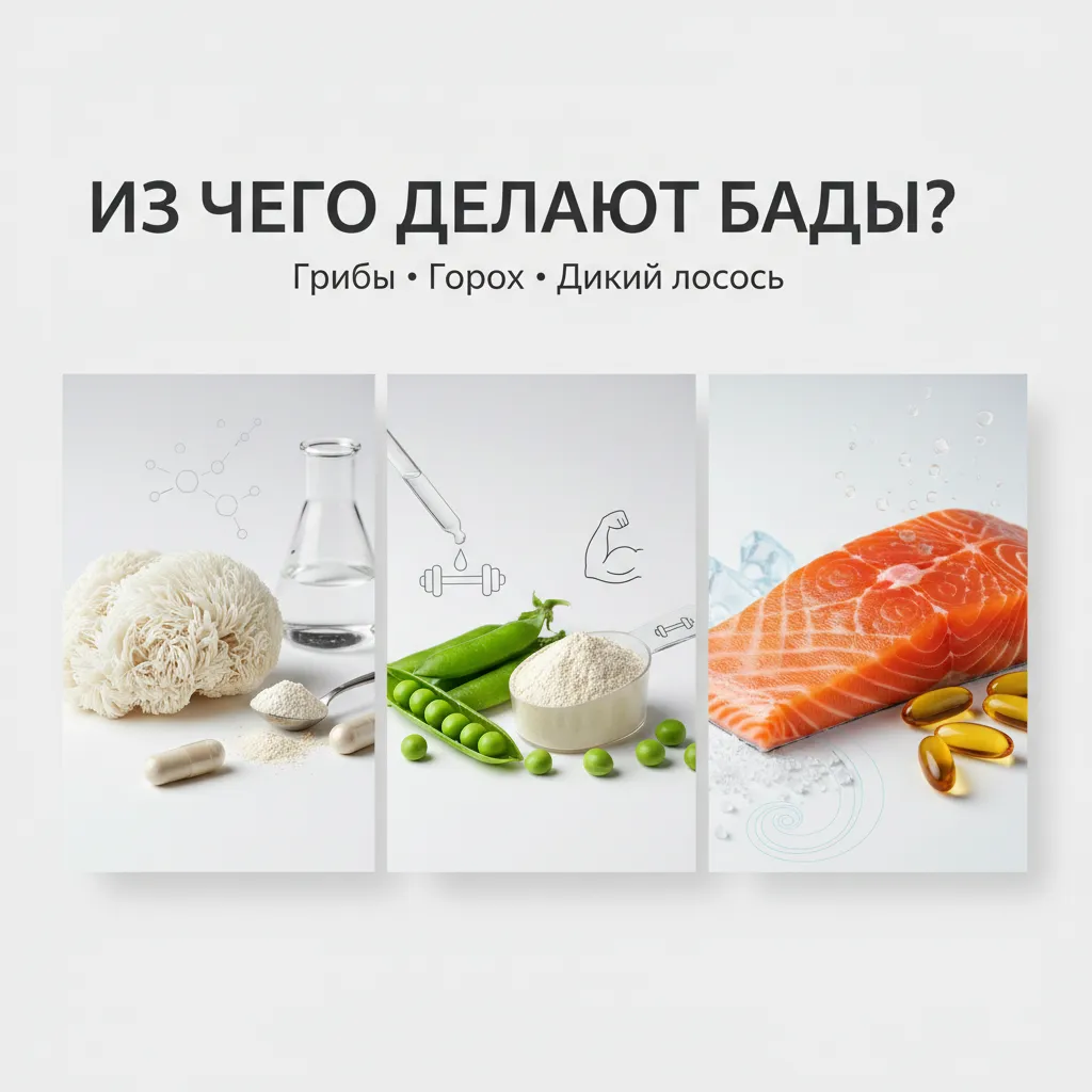Из чего делают БАДы: грибы для памяти, горох для мышц и дикий лосось