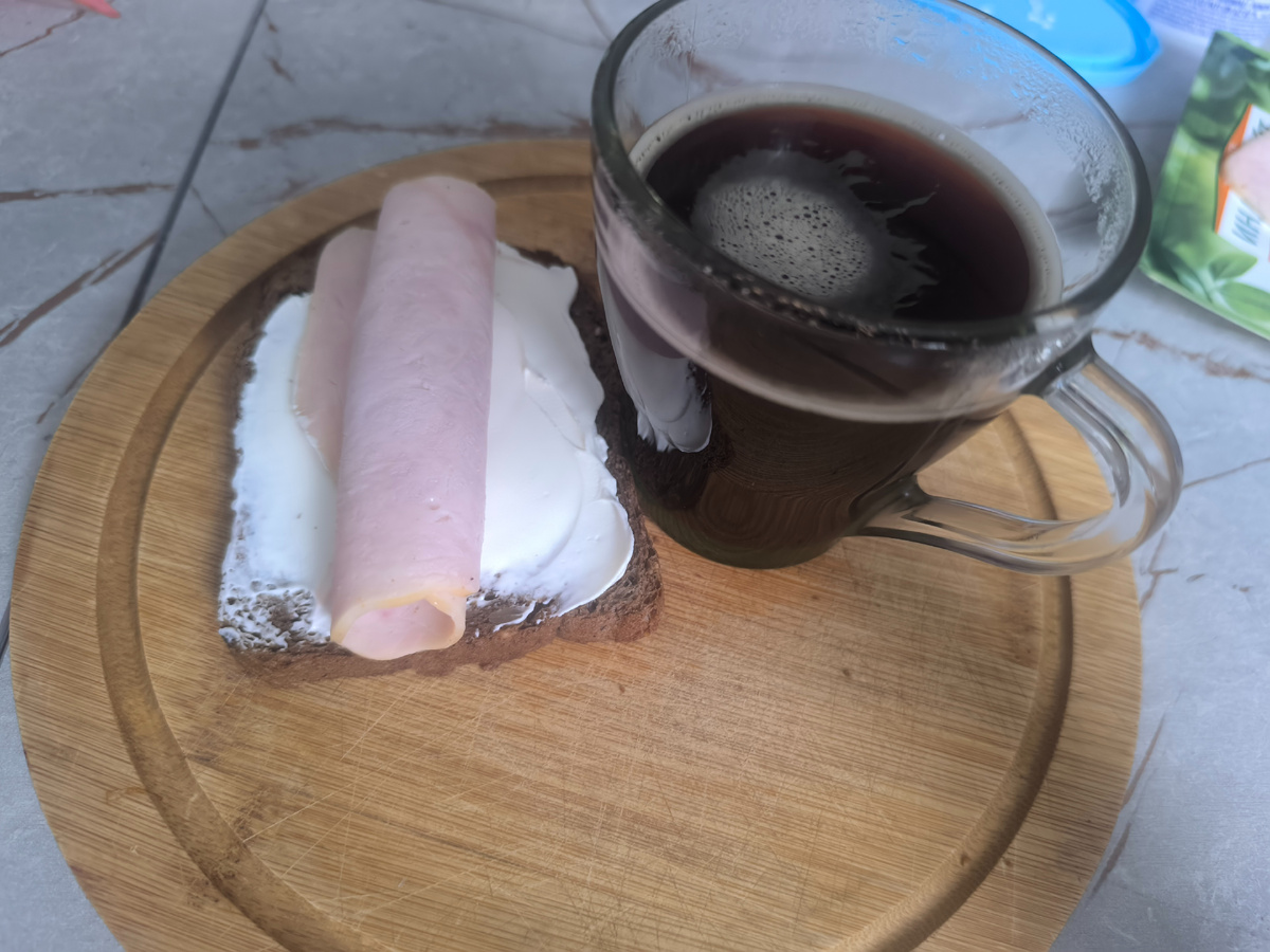 Кофе растворимый с сахаром. Тост с творожным сыром и ветчина из индейки.