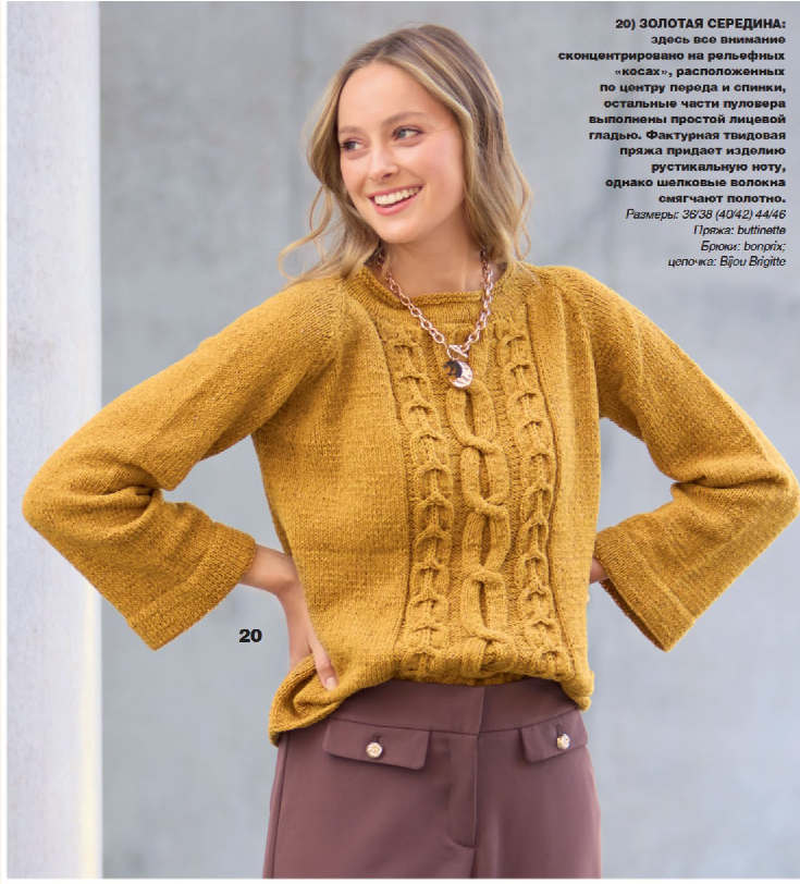 Добрый день, дорогие рукодельницы! Сегодня мы продолжим листать февральский номер журнала «Сабрина». Здесь, на мой взгляд, представлено множество интересных моделей. Главное - это ваше восприятие этих изделий! Часть первая Модели разнообразны, и я уверена, что каждая из вас найдёт что-то по своему вкусу. Мне понравились модели под номером: 20,21,22,23 Возможно, кто-то заметит, что в журнале много повторяющихся старых моделей. Однако, если внести небольшие изменения, они могут заиграть новыми красками! Итак, листайте журнал и делитесь своими впечатлениями. А я в это время собираю для вас вдохновляющую подборку узоров и идей для вязания кардиганов. 🧶 Буду очень благодарна, если вы подпишитесь на все мои соц сети: Вконтакте ссылка Телеграмм ссылка Одноклассники ссылка Ютуб ссылка Второй дзен канал ссылка Рутуб ссылка Мах ссылка Ещё подборки с журналами: Пуловер реглан с "косами". Пряжа: 55% шерсти, 23% полиамида, 15% вискозы, 7% шелка; 133м/Ъ50г. Спицы: 4 мм. Жилет с поясом. Пряжа: 100