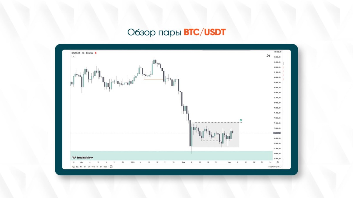 Пока валютный рынок лихорадит из-за геополитики, Bitcoin ведёт себя неожиданно спокойно. Это пауза перед движением или начало разворота? Разбираем текущую структуру рынка и делимся торговой идеей. На фоне напряжённости на Ближнем Востоке доллар усилил позиции, что спровоцировало активное движение по таким инструментам, как EURUSD и другим валютным парам. Волатильность выросла, участники рынка активно перераспределяют капитал. Однако BTCUSDT демонстрирует относительную устойчивость. Вместо резких распродаж мы наблюдаем консолидацию — цена удерживается в диапазоне и не реагирует на внешний фон столь агрессивно, как традиционные активы. Это говорит о сохранении баланса между спросом и предложением. На дневном таймфрейме Bitcoin формирует продолжительный боковой диапазон. Цена находится вблизи ключевой поддержки в районе 60 000. Этот уровень уже неоднократно выступал зоной интереса покупателей. Текущая структура указывает не на панику, а на накопление. Рынок словно ждёт триггер, который за