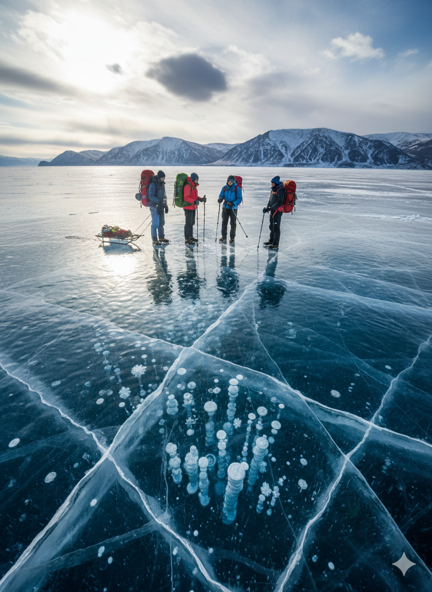 Лёд на Байкале замерзает необычно: он кристально прозрачен и пропускает солнечный свет, отчего вся поверхность сияет изнутри бирюзовым и зелёным. Метановые пузырьки, вмёрзшие в лёд, трещины с причудливыми узорами, наплески-«сокуи» — застывшие волны — всё это делает байкальский лёд главным природным арт-объектом России.