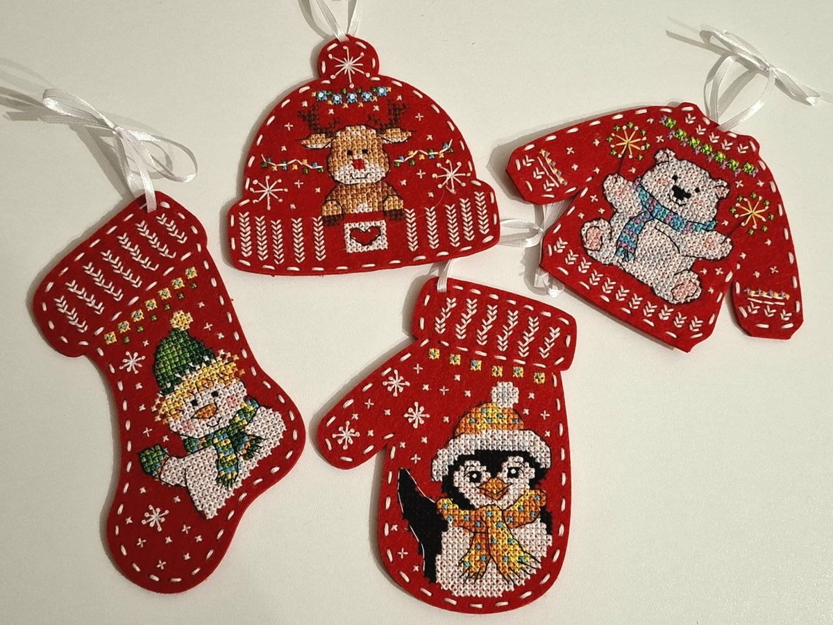 1. Вышила рукавичку с пингвином и носок со снеговиком от Жар-птицы, тем самым завершив серию фетровых игрушек