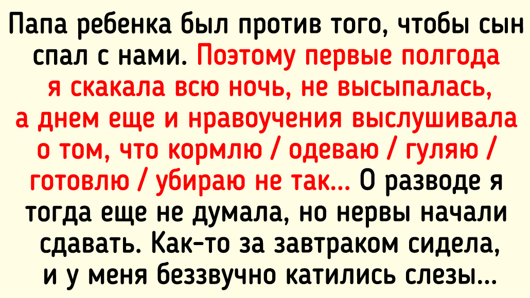 Папа ребенка был против того, чтобы сын спал с нами. Поэтому первые полгода я скакала всю ночь, не высыпалась от слова совсем, а днем еще и нравоучения выслушивала о том, что кормлю/одеваю/гуляю/готовлю/убираю не так. О разводе я тогда еще не думала, но нервы начали сдавать. Как-то за завтраком сидела, и у меня беззвучно катились слезы. Посмотрев на меня, отец ребенка сказал: «Ты плачешь, потому что хочешь плакать». © Rotatosk / Pikabu