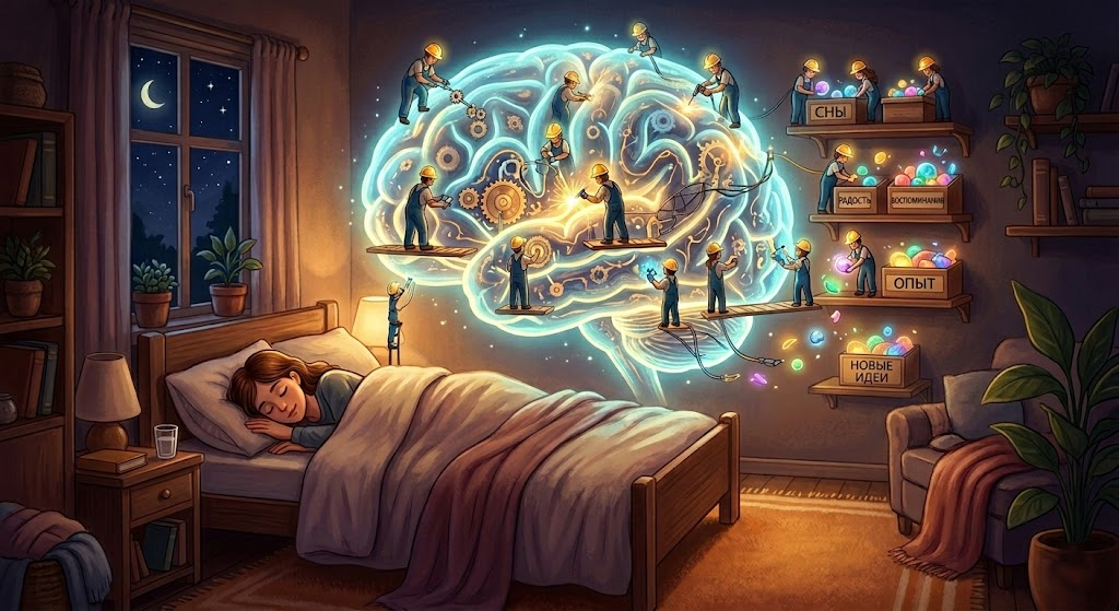 Многие думают, что сон — это когда мозг отключается и отдыхает. На самом деле всё наоборот: мозг работает 24/7, просто ночью он переключается на другую задачу. Днем он рулит нашими делами, а ночью начинает техобслуживание организма и разбирает завалы информации, которые накопились за день. Так что фраза «утро вечера мудренее» — это чистая физиология. За ночь мы проходим через несколько циклов, и в каждом есть две фазы. Сначала медленный сон. В самом начале (минут 10) мы просто дремлем, нас легко разбудить. Потом наступает легкий сон, где нам могут сниться всякие обрывки снов, но не сами сны. А самая крутая и важная часть — это глубокий сон, он длится около получаса. В это время организм реально восстанавливается: дыхание ровное, мышцы расслаблены, вырабатываются нужные гормоны вроде тестостерона и гормона роста. После этого наступает фаза быстрого сна - та, в которой мы видим сны. Тут мозг занят сортировкой воспоминаний: что важное — в долгую память, что нет — забыть. У нас внутри есть