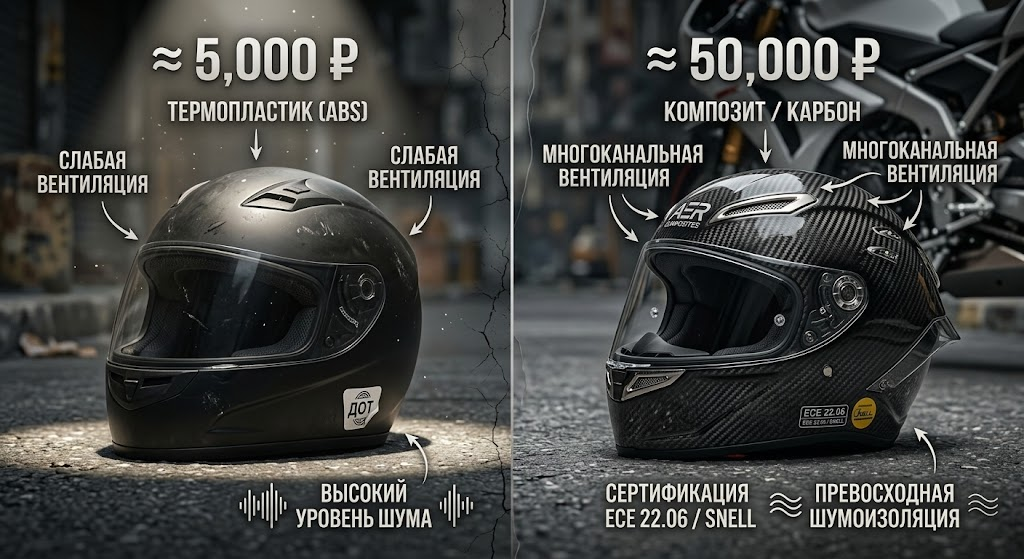 Знакомая картина: новичок выскребает все заначки, берет кредит, покупает мотоцикл мечты, а на экипировку денег уже не остается. И тогда он идет на ближайший авторынок или китайский маркетплейс и берет безымянную пластиковую каску за 5 тысяч рублей с мыслью: «Ну, на первое время сойдет, пенопласт-то везде одинаковый». А потом в комментариях начинаются жаркие споры. Владельцы топовых Shoei, Arai или Schuberth крутят пальцем у виска, а парни в китайских шлемах обвиняют их в снобизме и переплате за наклейку с брендом. У старых байкеров есть циничная, но очень точная поговорка: «Если у тебя голова за 10 долларов, покупай шлем за 10 долларов». Давайте разберем без эмоций, за что именно вы отдаете 50-70 тысяч рублей, покупая дорогой шлем, и почему дешевый Китай может стоить вам гораздо дороже. Дешевые шлемы делают из термопластика (ABS). При сильном точечном ударе или на холоде такой пластик может просто расколоться, как дешевое ведро.