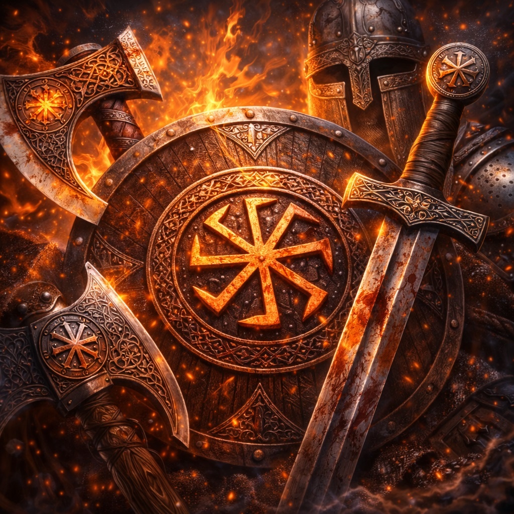 И точно не случайная гравировка. Когда на клинке, щите или нагрудной пластине появлялся Коловрат, это было заявление. Не о вкусе. О мировоззрении. О принадлежности к кругу. О понимании цикла жизни и смерти. Сегодня многие спорят о символе, не задавая главный вопрос: зачем его наносили на оружие и доспехи? Для красоты? Для устрашения? Для защиты? Или для чего-то глубже? Разберёмся конкретно, без фантазий и без политической шелухи. Коловрат — символ вращения, кругового движения, солнечного хода. Это не статичный знак. Он динамичный. Его смысл — в цикле: рассвет, зенит, закат, ночь, новый рассвет. Воин, идущий в бой, прекрасно понимал одну вещь: жизнь — цикл. Сегодня ты жив, завтра можешь погибнуть. Но род продолжается. Солнце продолжает движение. Нанесённый на оружие Коловрат — это напоминание: смерть — не конец круга, а его часть. Это психологический якорь. Бой — это предельное состояние. Там важна концентрация. Важна внутренняя устойчивость. Л