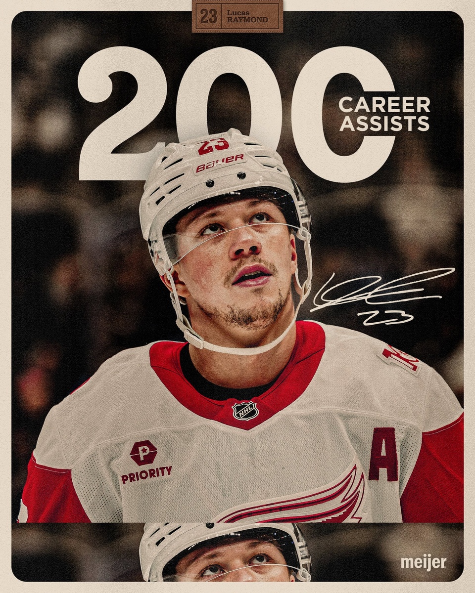 🚘 Лукас Рэймонд (379 игр) стал самым быстрым игроком «Красных крыльев», сделавшим 200 передач в НХЛ со времён Павла Дацюка в сезоне