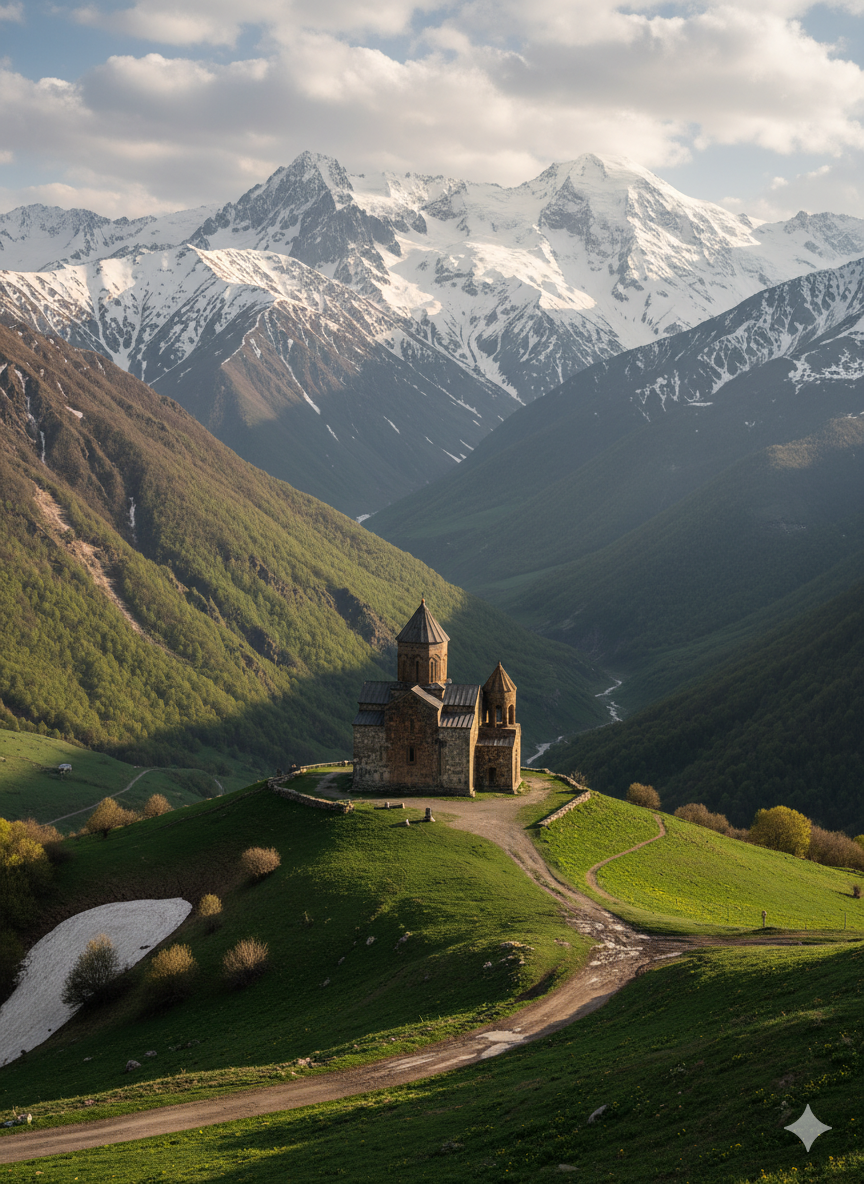 В апреле дорога к Гергети уже открывается (примерно с середины месяца), и ранняя весна делает подъём особенно впечатляющим: снег ещё лежит на склонах, а у подножия уже цветут сады. Церковь аскетична внутри — без электричества, в свете свечей — и это лишь усиливает ощущение прикосновения к живой истории.