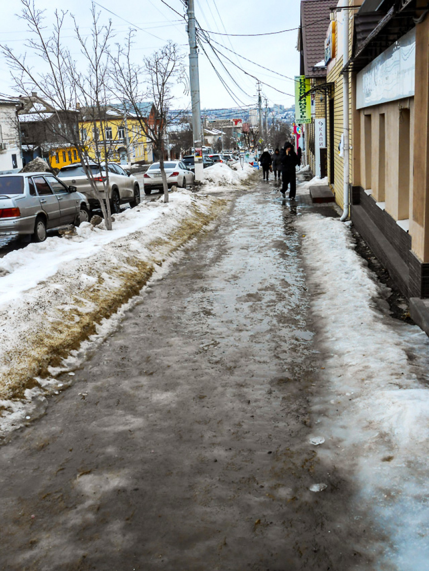 В критической ситуации оказались сегодня, 3 марта, пешеходы на центральной улице "старого" Камышина - Пролетарской. По тротуарам течет талая вода по спрессовавшемуся льду. Идти практически невозможно.
