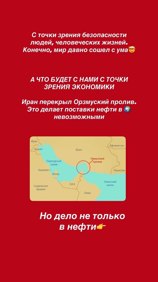 Почему это касается нас с вами🌚🌚🌚 Что это значит для нас с вами с точки зрения ЭКОНОМИКИ. Я понимаю всех, кому тревожно, страшно и непонятно. Обнимаю вас 🫂 При этом ждать спокойствия не стоит. То, что происходит последние 6 лет - это новая реальность. В которой мы не должны ждать, что вот ещё чуть-чуть и всё наладится. Это не так. И новая способность нашей психики: с открытым сердцем принимать все происходящее, делать то, что должен и не откладывать жизнь на потом. 📍Что же на самом деле происходит? США и Израиль стали бомбить Иран для «предотвращения ударной угрозы». Эта история длится давно. Мировое сообщество в лице США боятся, что Иран разработает (или уже разработал) ядерную бомбу. И всячески пытаются это предотвратить. Иран в ответ стал наносить удары по американским военным базам, которые находятся в странах Персидского залива. Это в том числе Саудовская Аравия, Арабские эмираты (и там же Дубай) и т.д. На карте показала, где сейчас весь сыр бор👆 📍Что это значит дл