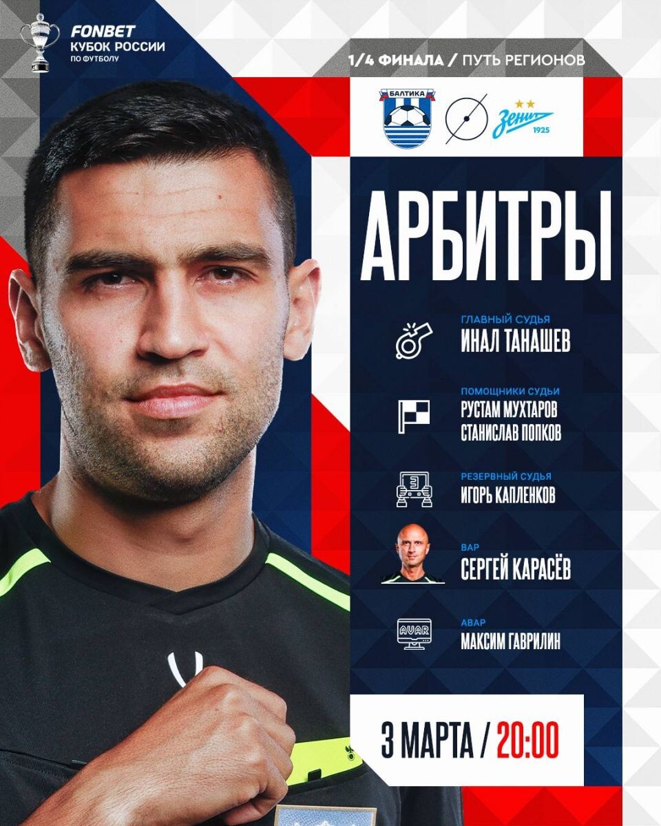 Стали известны имена арбитров, которым предстоит обслуживать матч 1/4 финала Кубка России между калининградской «Балтикой» и петербургским «Зенитом». Встреча состоится сегодня, 3 марта, в Калининграде и начнется в 20:00 по московскому времени. Назначение на эту игру получила бригада арбитров во главе с Иналом Танашевым из Нальчика. Ассистировать главному судье будут Рустам Мухтаров и Станислав Попков. Резервным арбитром выступит Игорь Капленков. За систему видеопомощи арбитрам (VAR) будет отвечать авторитетный Сергей Карасев, а его ассистентом (АВАР) назначен Максим Гаврилин . В активе 28-летнего Инала Танашева на данный момент 19 матчей в рамках Российской Премьер-Лиги и Кубка страны. Статистика личных встреч арбитра с командами представляет интерес для анализа. С «Балтикой» в рамках чемпионата России Танашев пересекался четырежды. Эти игры неизменно завершались вничью: 21 сентября 2025 года калининградцы разошлись миром с «Ростовом» (0:0), 26 октября 2025 года была зафиксирована нуле