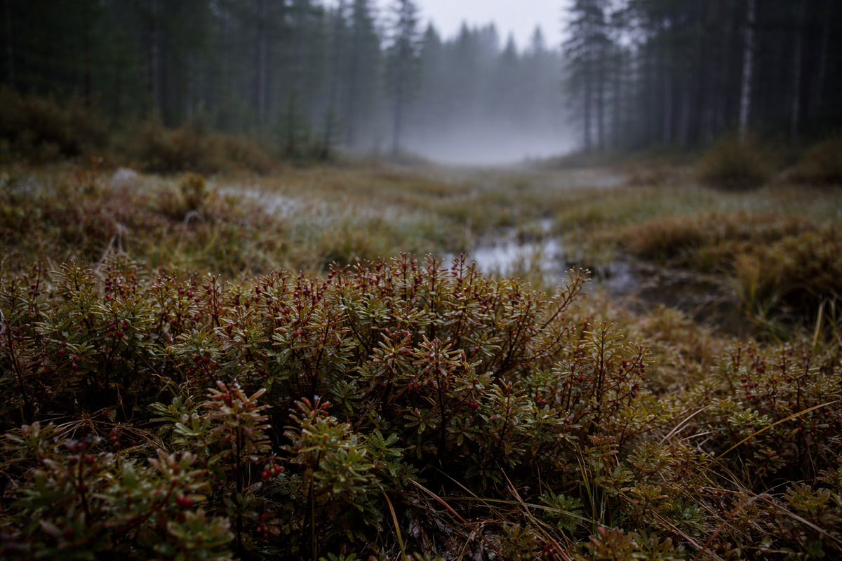 Болото встретило меня тихо. Туман стелился низко, кочки были влажные, но наст держал. Я прошёл к первому кусту — и остановился.