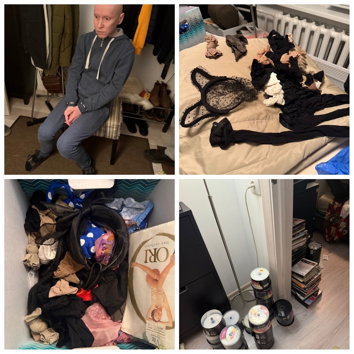 Когда в дом вошли следователи, они нашли целый склад извращений: стопки компакт-дисков с записями преступлений, нижнее детское белье, капроновые колготки, ободки с заячьими ушками. Всё это было аккуратно разложено, подписано, систематизировано.