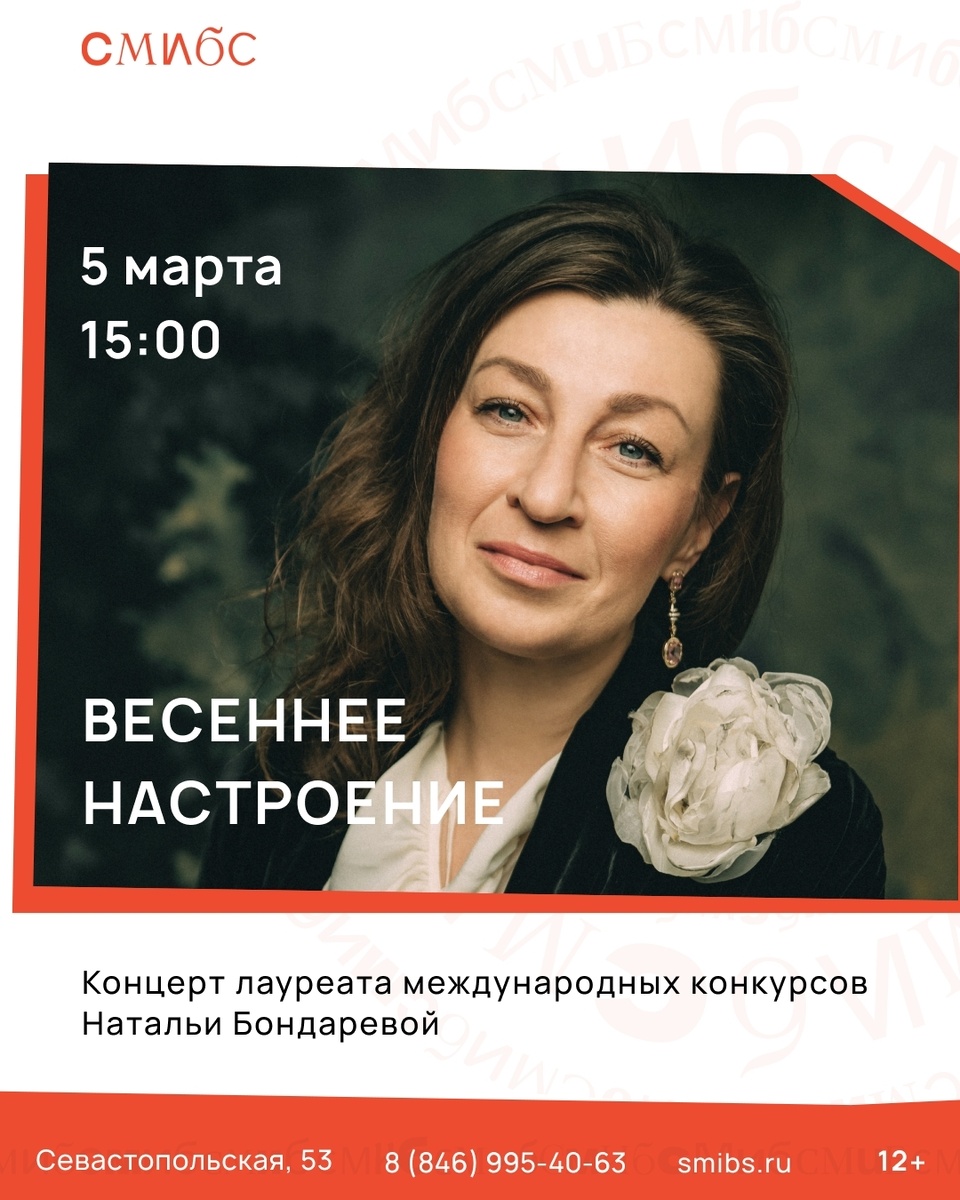 Приглашаем 5 марта в 15:00 на концертную программу, посвященную Международному женскому дню. Для гостей выступит Наталья Бондарева — солистка Самарского академического театра оперы и балета имени Д. Шостаковича, лауреат премии «Самарская театральная муза». В ее исполнении прозвучат произведения А. Бабаджаняна, А. Пахмутовой, И. Дунаевского, И. Юрьевой, Б. Фомина, Л. Руслановой, Л. Зыкиной. Место встречи: Библиотека № 23 (Севастопольская, 53). Вход свободный.