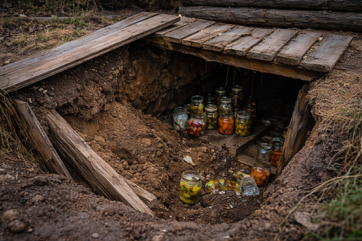Запасы в тайге — это не просто еда. Это месяцы труда, аккуратности и расчёта. Каждый мешок картошки, каждая банка с грибами — это часть зимы, которая уже пережита заранее. Поэтому звук, который я услышал в то утро, не был обычным. Это был глухой, тяжёлый удар. Сначала я подумал — упала ветка. Но звук пришёл не со стороны леса, а снизу, из-за избы, где под навесом находится погреб. Я вышел сразу. Земля вокруг входа была просевшей. Доски настила перекосились, одна сторона крыши погреба осела почти на ладонь. Снег уже сошёл, земля напиталась водой после резкой оттепели. Несколько тёплых дней подряд — и грунт размяк. Я подошёл ближе и осторожно наступил на край настила. Он пружинил. Плохо. Я снял верхние доски и заглянул внутрь. Одна из несущих балок дала трещину. Земля с края склона частично осыпалась внутрь. Несколько банок лежали боком, две разбились — стекло блестело в полумраке. Запах рассола смешался с влажной глиной. Погреб держался, но баланс был нарушен. Первое правило — не лезть