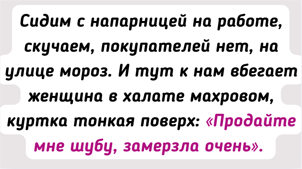 - Сидим с напарницей на работе, скучаем, покупателей нет, на улице мороз. И тут к нам вбегает женщина в халате махровом, куртка тонкая поверх: «Продайте мне шубу, замерзла очень». На ее фигуру у нас была мутоновая шуба как раз ее размера. Она накинула на халат, покрутилась возле зеркала и сказала: «Покупаю. А то я за хлебом в магазин пошла, замерзла, и решила шубу купить». Расплатилась и убежала. Все это произошло за какие-то 10 минут. Мы стоим в шоке после ее ухода. Заглядывают к нам продавцы с соседнего отдела и спрашивают: «Она что, на сдачу от хлеба шубу купила?» Долго мы еще эту женщину вспоминали добрым словом, так как в этот день она была единственным покупателем.