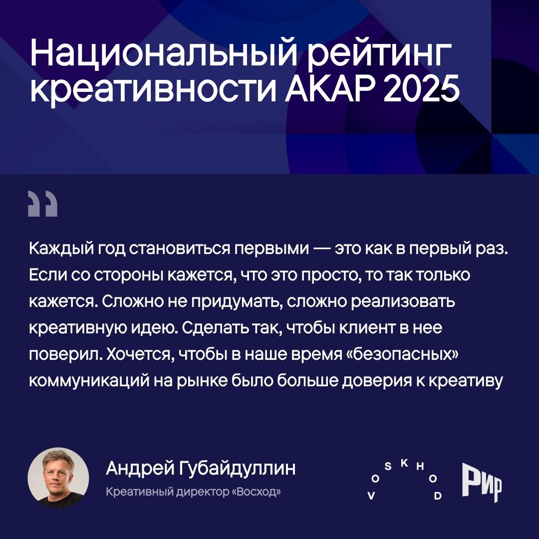 : 🏆 Рейтинги креативности ➡️Национальный рейтинг креативности: «Восход» (1815 баллов) ➡️Digital: TEAMMATE (198 баллов) ➡️Брендинг: «Супрематика» (449 баллов) ➡️Маркетинговые услуги: «Родная речь» (501 балл) 🏆 Рейтинги эффективности ➡️Рейтинг коммуникационной эффективности: «Восход» (467 баллов) ➡️Рейтинг эффективности медийных агентств: SkyTecKnowlogy (SkyAlliance) (304 балла) Рейтинги разработаны Комиссией по фестивальной и конкурсной деятельности 🔥🔥 и Аналитическим центром Российской индустрии рекламы. 🌟 Реакцию лидеров — смотрите в карточках! 🔜 РИР – чтобы быть в курсе!