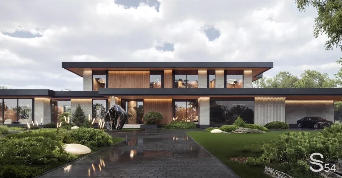 Северный дом часто представляют сдержанным, закрытым, функциональным. Климат диктует простоту, материалы — практичность, архитектура — осторожность. Но проект Whispering Oaks от Studia 54 в Екатеринбурге доказывает обратное. Cтрана: Россия Площадь: 1400 м² Обсудить ваш проект с экспертом от Studia 54: WhatsApp +7 (931) 270-54-54 welcome@studia-54.ru Это резиденция площадью 1400 м², встроенная в дубовую рощу. Не дом на участке, а архитектура, которая стала частью природной среды. С северной стороны открывается вид на массив вековых деревьев, и именно этот пейзаж стал отправной точкой концепции. Силуэт здания вытянутый и раскидистый. Второй этаж формирует выразительный объем, благодаря которому дом воспринимается не как «загородный коттедж», а как современная резиденция с характером. Парадный вход подчеркнут скульптурой из натурального камня, задающей тон всему пространству. Даже стеклянный гараж интегрирован в общую композицию и работает на эстетику фасада, а парковка аккуратно скрыта п