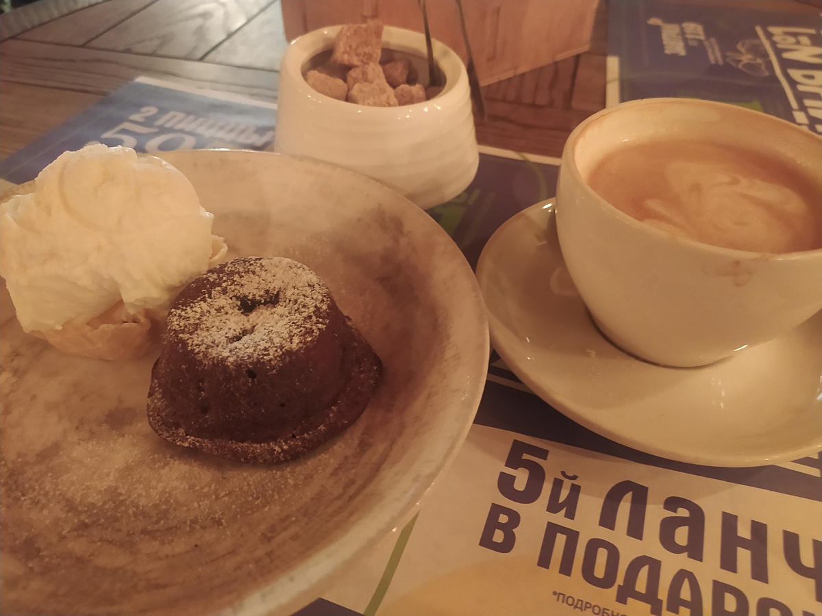 Кофейня №1. Лично у меня ассоциации, запах кофе, который только что смололи и вкус свежего десерта. Логично же, кофейня – это кофе и десерт. Где-то год назад, когда я еще не представляла жизнь без кофе, зашла я в эту «кофейню». В ту, что находиться на Невском проспекте. Я сразу же ощутила сильный аромат столовской еды. Пока искала себе место заметила на столах пельмени, пиццу, хачапури, но не заметила людей, которые проста зашли попить кофе. Из чего сделала вывод, Кофейня №1 – более дорогой аналог столовой № 1, с более изысканным меню. Заказ сделала кофейный – кофе и десерт. Ждала долго, сначала принесли кофе, а когда он уже успел остыть принесли десерт. Десерт был шоколадный кекс с мороженым и холодным кофе. Сегодня повторила эксперимент. Интуиция мне говорила: «встреча закончилась, поди в другое место, где точно только кофе и десерты». Нет, осталась, в прошлый раз десерт был не плохой. Народу было мало, так что ароматов столовки не было, ну и ароматов кофе тоже. Выбор остановился на