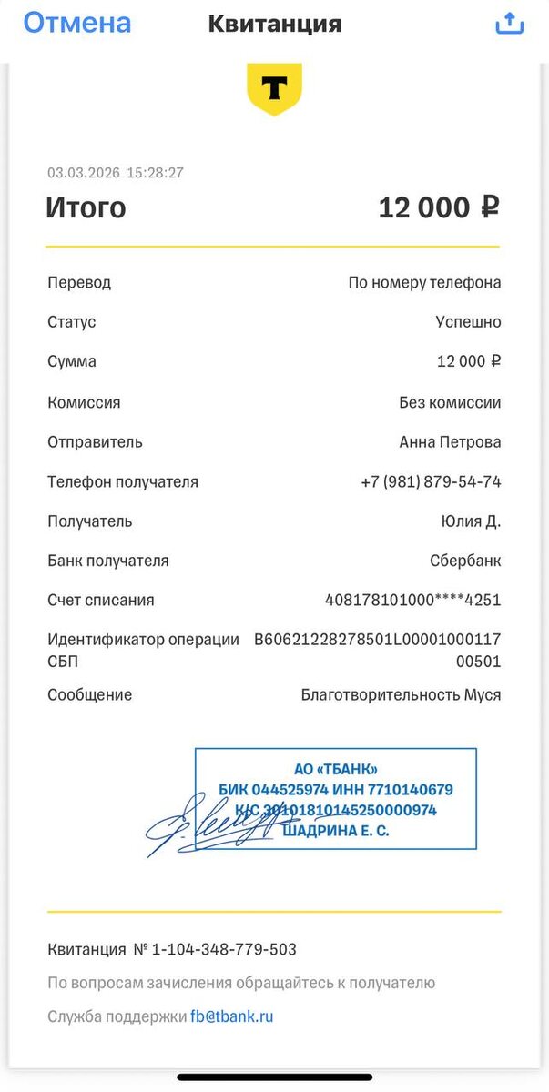 🥰 Огромная вам благодарность от меня лично и от нашей храброй кошечки Муси, две недели оплачены! Муся конечно очень привыкла к Юле, к её дому , к её заботливым рукам❤️ Но я все же не теряю надежды, что Мусю увидит тот самый ЕЁ ЧЕЛОВЕК 🥰 Заберёт в семью и будет заниматься Мусей с любовью и заботой, соблюдать рекомендации Юли! 8(981)706-83-99 Анна Муся ждёт своего человека 😻