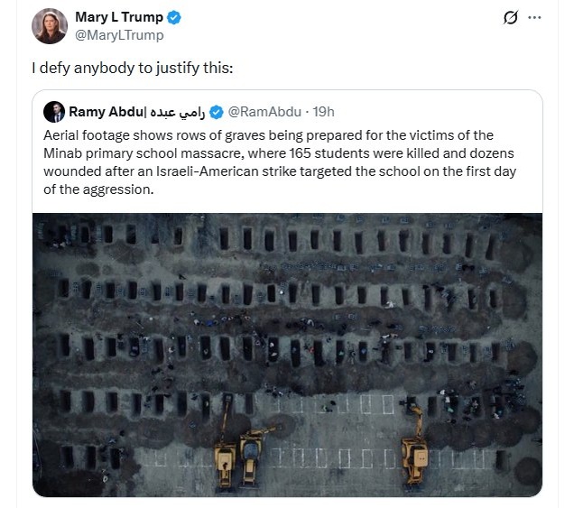 Donald Trump's niece Mary L Trump reposts photo of a cemetery with graves prepared for the victims of the Minab school strike in Iran