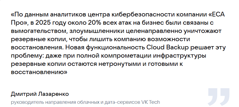 Помните, как в фильмах про хакеров злодеи стирают все данные и оставляют после себя лишь чёрную пустоту на экране? В реальной жизни такие атаки — не выдумка. Киберпреступники могут: зашифровать важные файлы (и потом требовать выкуп за расшифровку); стереть резервные копии (чтобы у компании не осталось шансов восстановиться); подменить бэкапы на заражённые версии (и тогда восстановление только усугубит проблему). Но теперь у российских компаний появился надёжный щит — в сервисе Cloud Backup на платформе VK Cloud появилась функция неудаляемых резервных копий. Разберёмся, что это такое и почему это важно. Представьте сейф, который нельзя открыть до определённой даты. Вы кладёте туда драгоценности (в нашем случае — резервные копии данных), закрываете, а ключ выбрасываете. До назначенного дня никто — даже вы сами — не сможет ни открыть сейф, ни что‑либо в нём поменять. Точно так же работают неудаляемые бэкапы: их нельзя удалить; их нельзя зашифровать; их нельзя изменить. И это работает даже