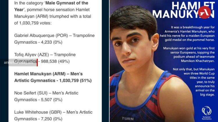 Член сборной Армении по спортивной гимнастике Гамлет Манукян признан лучшим гимнастом Европы 2025 года, сообщила Федерация гимнастики Армении. Голосование на сайте Европейской федерации гимнастики (UEG), по итогам которого определился победитель в номинации «Гимнаст года среди мужчин», стартовало четыре дня назад. «Благодаря вашей солидарности и поддержке Гамлет Манукян признан лучшим гимнастом года среди мужчин», — говорится на странице организации в Facebook. В числе претендентов были азербайджанский гимнаст Тофик Алиев, батутист Габриэль Албукерке (Португалия), а также представители спортивной гимнастики Ноэ Зайфат (Швейцария) и Люк Уайтхаус (Великобритания). В сентябре 2025 года новый элемент в спортивной гимнастике назвали именем армянского гимнаста Гамлета Манукяна. Спортсмен в ходе международного турнира World Challenge Cup в Париже в упражнении на коне исполнил новый элемент, который официально назвали «Манукян». Представитель Армении также прошел квалификационный этап и вышел
