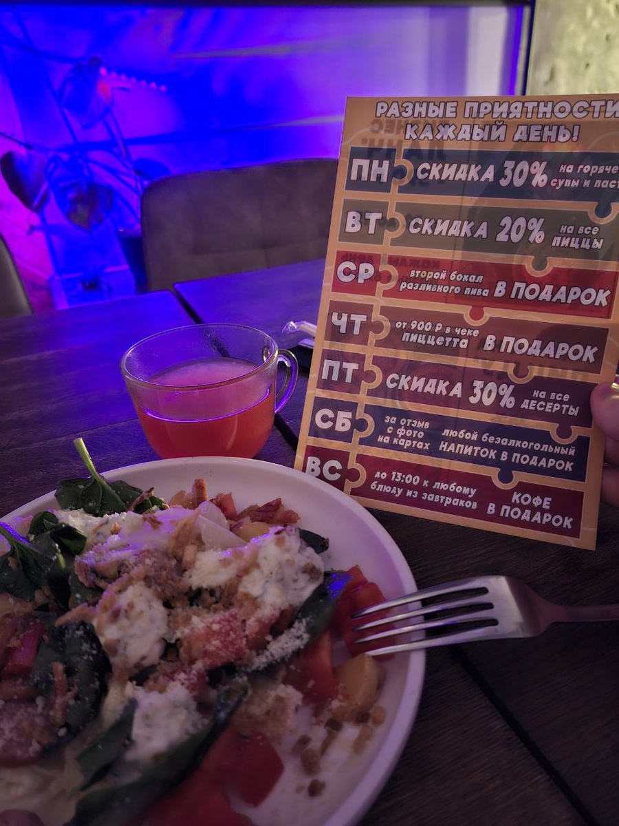 бюджетом. Но иногда усталость берет своё, и стоять у плиты - это выше моих сил) В такие моменты мы с мужем выбираем отпустить контроль и поесть всё, чего душа пожелает (кто никогда не ест фастфуд пусть первым кинет в меня палку😄) Вот вчера как раз был такой день🫠 Мы пошли в кафе-баре неподалеку - Бекки, неподалеку от Европейского парка. Поели, перевели дух, посмотрели немного мультик "Рататуй" там же на проекторе. В кафе по-своему уютно, и поесть можно разное - от пицетты с кофе, до бургеров или даже гедза😁. Вообще это часть сети, в которой есть ещё кафе Нами и Бокка, в Нами мы тоже бывали не раз. У всех трех кафе есть общий канал, где можно посмотреть меню и акции. Не реклама, чисто моя рекомендация, особенно для тех, кто бывает в этом районе (например гуляет в парке неподалеку).