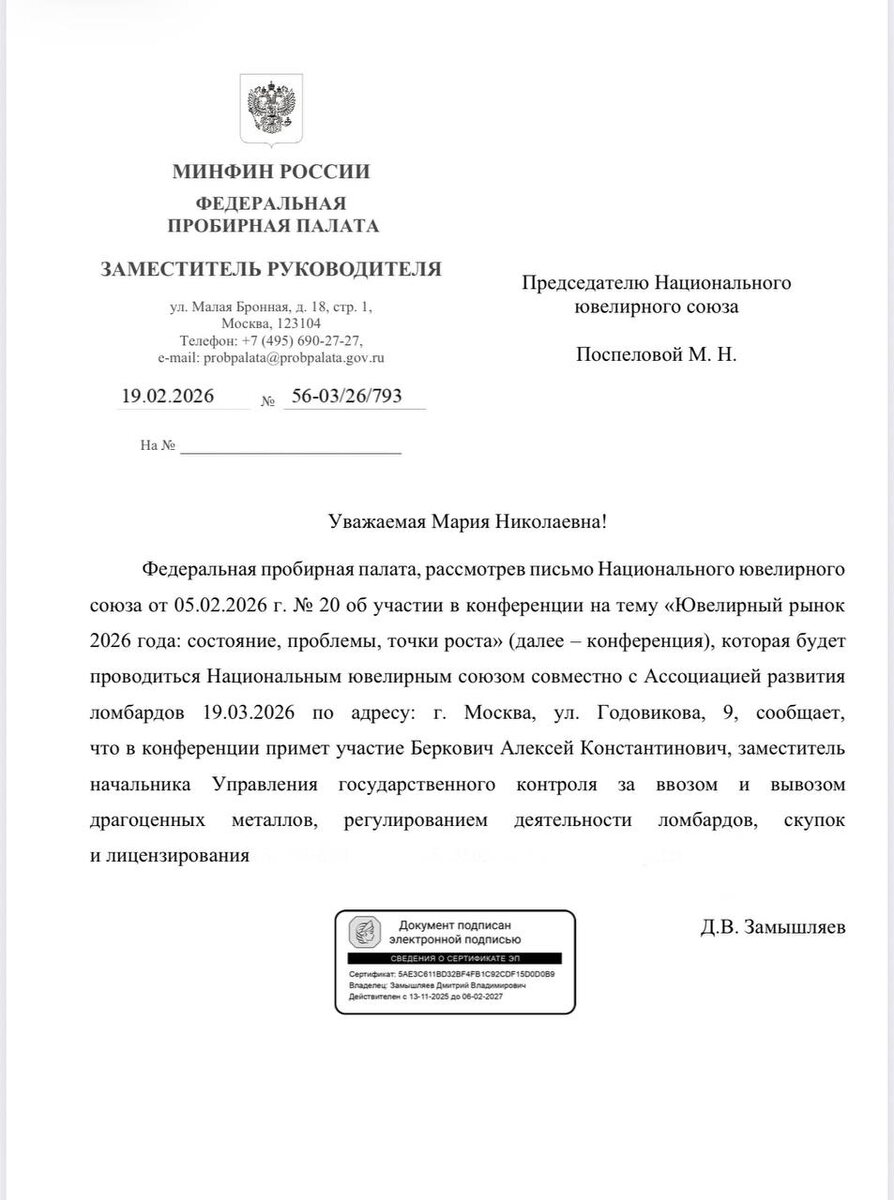 Организаторы московской ювелирной конференции 19 и 20 марта продолжают делиться информацией о грядущем событии. Федеральная пробирная палата подтвердила свое участие в мероприятии. В конференции примет участие Алексей Константинович Беркович, заместитель начальника Управления государственного контроля за ввозом и вывозом драгоценных металлов, регулированием деятельности ломбардов, скупок и лицензирования. Ранее свое участие подтвердил Банк России, АО Гознак и другие значимые участники рынка. Присоединяйтесь к коллегам! Регистрируйтесь на бесплатную конференцию ювелиров и ломбардов, получите ответы на свои вопросы.