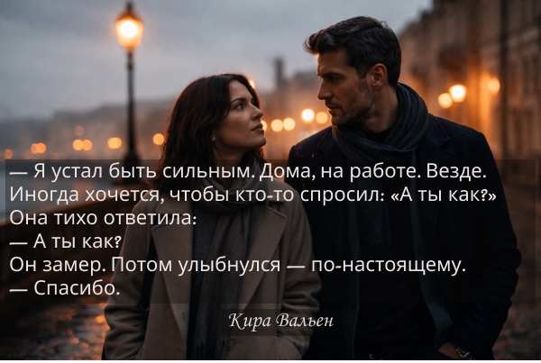 — Я устал быть сильным. Дома, на работе. Везде. Иногда хочется, чтобы кто-то спросил: «А ты как?»