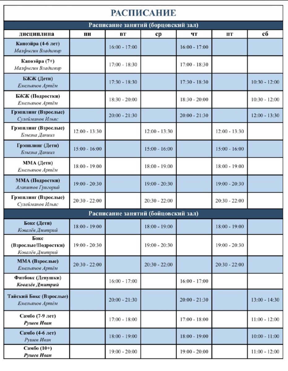 У нас небольшие, но очень приятные изменения! Сохраняйте новое расписание, чтобы не запутаться: 🥋 Бразильское Джиу-Джитсу (Дети) ➡️ ВТ/ЧТ — 17:30-18:30 ➡️ СБ — 10:30-12:00 🥊 Фитбокс (Женская группа) ➡️ ВТ/ЧТ — 16:00-17:00 Ждем старых и новых чемпионов!