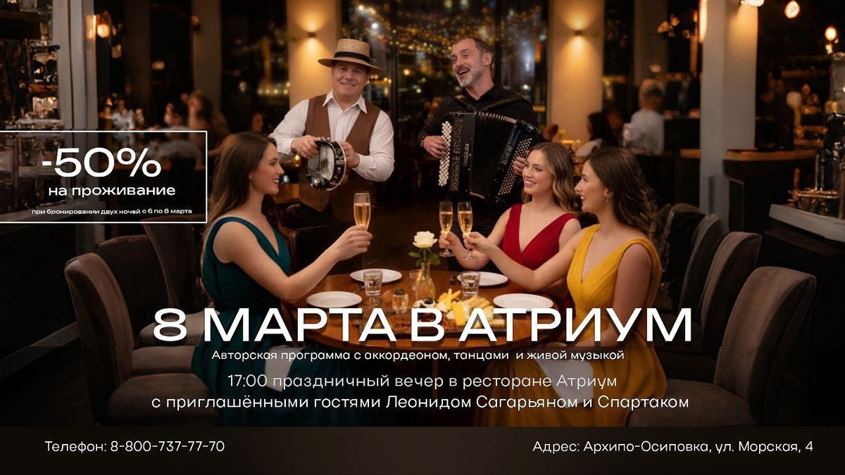 8 марта в ресторане «АТРИУМ» будет вечер с живой музыкой, танцами и той самой атмосферой, когда не хочется никуда спешить. 💐 В программе приглашённые артисты с авторской программой «Берегите женщин, женщины берегитесь!». 📞 Телефон: 8-800-737-77-70 🌐 Сайт: atrium-hotel.ru 📍 Адрес: Архипо-Осиповка, ул. Морская, д. 4 📍 По вопросам размещения объявлений, обращаться @arkhipkalive_bot