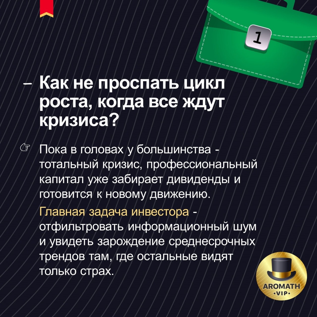 "? В прошлую пятницу провели большой закрытый эфир Ароматный вечер🌙 Клуба прибыльных инвесторов AROMATH-VIP🎩 под названием "Стратегия Штанга и новые лидеры рынка 2026". Пока толпа в панике ищет спасения в облигациях или замирает в ожидании очередного обвала, мы с участниками Клуба🎩 по полочкам разобрали текущую ситуацию на рынке. ❓ Главный вопрос сейчас не в том, "что купить", а в том, как не оказаться вне игры, когда цикл роста наберет полную силу. 👆 На карточках выше - 5 важных инсайтов эфира.