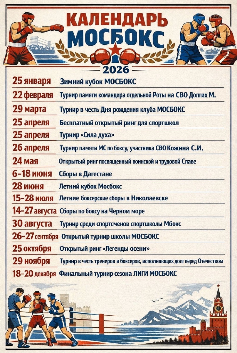 ! 🔥 Не упусти свой шанс — успей записаться на открытые ринги и сборы, чтобы быть в ударе весь год! ✅ Все ключевые мероприятия МОСБОКС на 2026 год собраны в одном календаре: - Открытые ринги — идеальная возможность проверить себя и набрать опыт. - Сборы — прокачай уровень вместе с лучшими тренерами и спортсменами. - Турниры — участвуй и готовься к большим победам! 🗓 Планируй заранее — записи идут полным ходом! 👉 Вот все мероприятия 2026 года — стань частью мира МОСБОКС уже сегодня! moscowboxing.ru/sorevnovan...