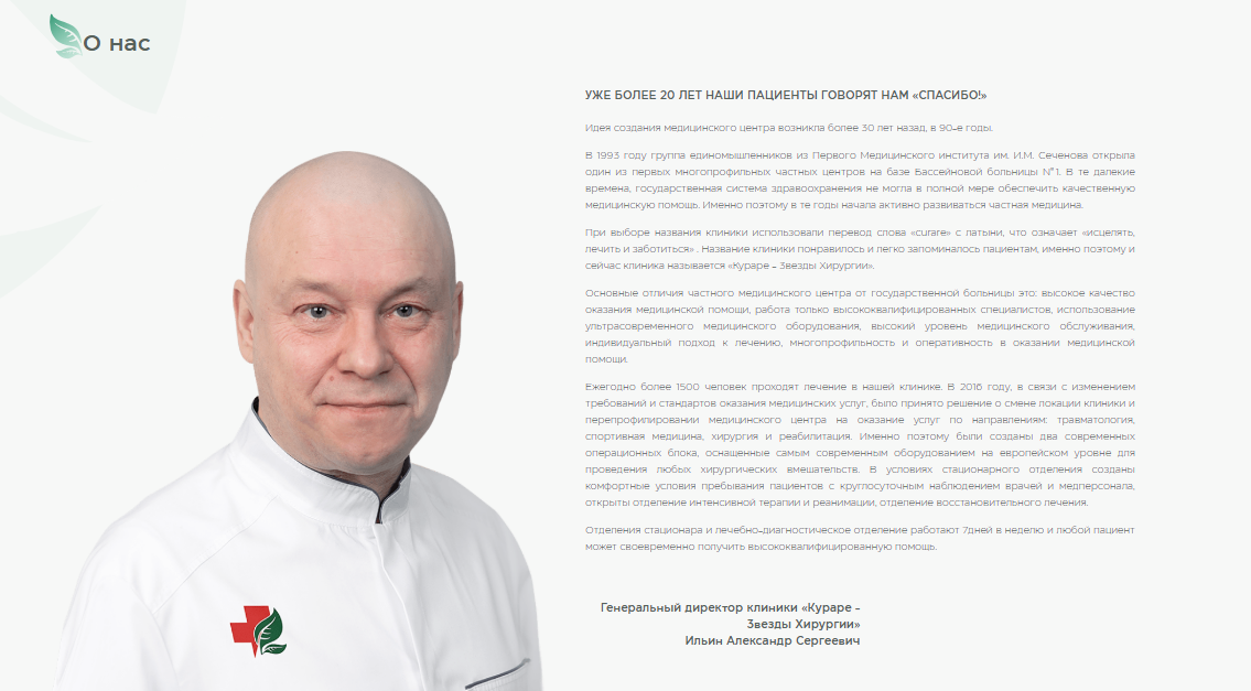 Плюсы: высокий рейтинг среди пациентов, собственные операционные блоки, широкий профиль хирургических вмешательств, опытный главврач-травматолог, удобный режим работы без выходных.