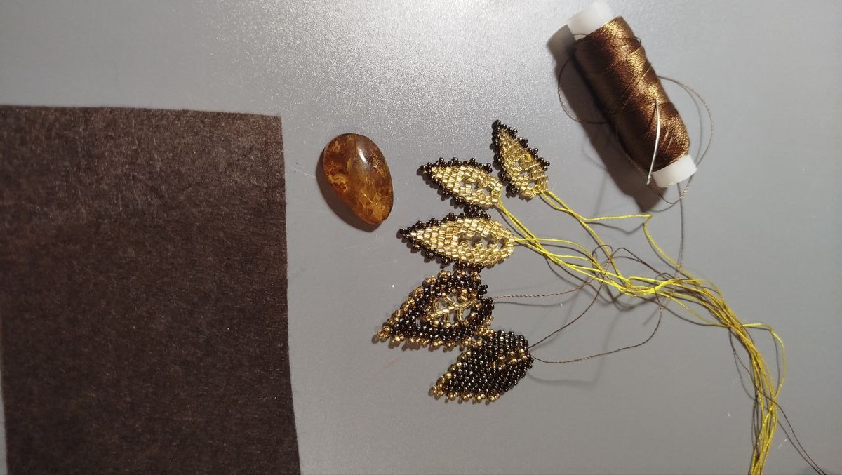 Приветствую всех на моем канале! И, конечно же, хочу поздравить всех с долгожданным приходом весны, а всех милых женщин, девушек с Международным женским днем, с 8 Марта! Сегодня мы снова будем с вами творить!)) В прошлой статье я показывала вам, как сплести из бисера простые листочки. А еще, я обещала показать, как можно использовать эти листики в готовых изделиях. Давайте начнем. Сегодня мы с вами будем создавать брошь. Для работы я возьму небольшой кусочек жесткого фетра, янтарный камень (кабошон), листья из бисера, которые сделала ранее, чешский бисер нескольких цветов, янтарные бусинки, а так же, как обычно, тонкую иголку и синтетическую нить. Намечаю на фетре форму будущей броши. Приклеиваю клеем момент-красталл камень. Обшиваю кабошон мозаичной техникой по кругу тремя рядами бисера: сначала темно-коричневым, потом золотым, и последний черным. Как обшить кабшон такой техникой я уже показывала в прошлой статье. Сбоку обшивка вглядит так: Примеряю листочки и начинаю их пришивать