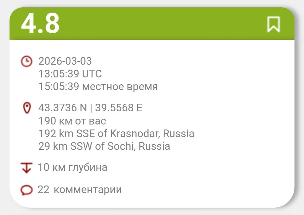 Еще одно землетрясение произошло возле Сочи. По данным Европейско-Средиземноморского сейсмического центра (EMSC), подземные толчки были зафиксированы сегодня в 16:05, эпицентр находился в акватории Чёрного моря в 28 км от Сочи. UPD: Магнитуда – 4,8 💜 Мы в MAX 👍 ТК Краснодар | Подписаться